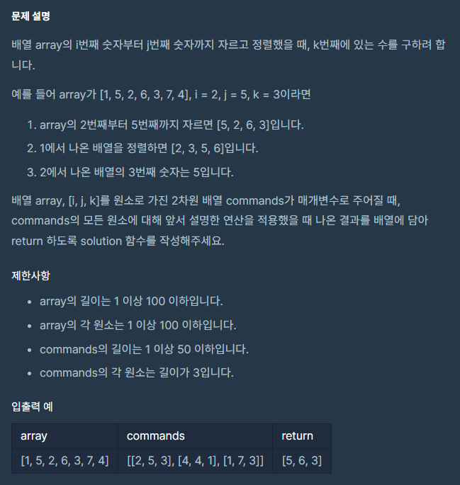 즉, 1번을 보면 array[1, 5, 2, 6, 3, 7, 4]의 2번째(인덱스1)부터 5번째(인덱스4)까지 자르면 [5, 2, 6, 3]입니다.